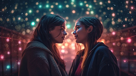 Two women are kissing. Beautiful light, bokeh effect. Valentine's Day, love. LGBT, lesbian couple, relationship. Diversity, homosexuality. Generative AI