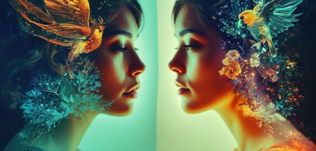 Two female faces with vibrant neon colors facing each other. Human souls in love. Women couple. Astral body, esoteric and spiritual life concept