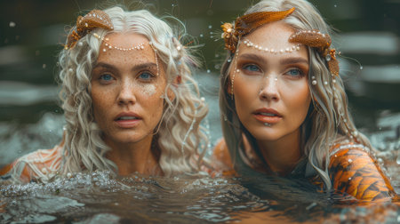 Two senior women styled as enchanting mermaids in a natural water setting, showcasing beauty, fantasy, and elegance with detailed aquatic costumes.