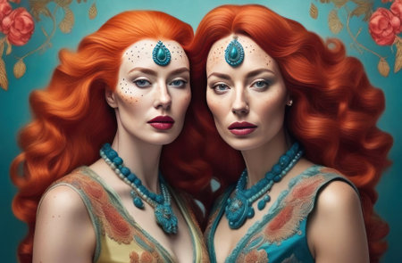 Explore the mystic allure of these twin red-haired beauties adorned with turquoise jewelry and captivating amber eyes. Perfect for your fantasy collection. Digital Art. Generated A.I.