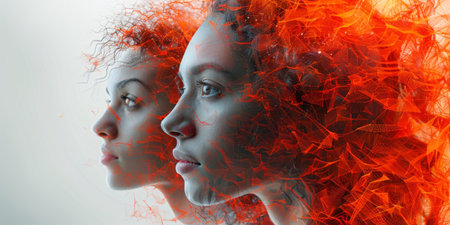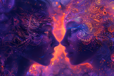 Surreal and artistic composition, two individuals facing opposite directions. Hair and shoulders are adorned with a vibrant, cosmic-like background