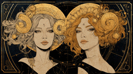 Gemini tarot style illustration depicts two women with elaborate hairstyles and gold details, surrounded by celestial elements and astrological symbols in a dark background