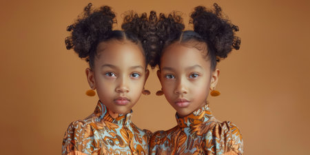 Two young girls with brown hair and brown skin are standing next to each other. They are wearing matching outfits and have their hair in pigtails. The girls are posing for a picture