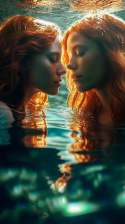 Gentle touches of two young women underwater in bright transparent dresses. Generative AI