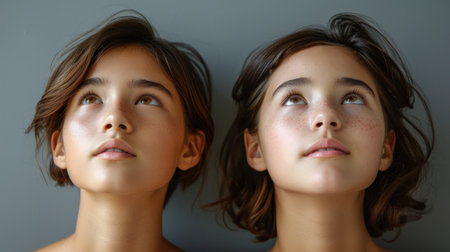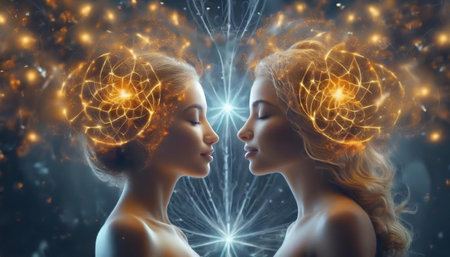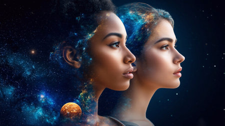 Dreamy portrait of twin women with cosmic background, embodying celestial beauty and serenity