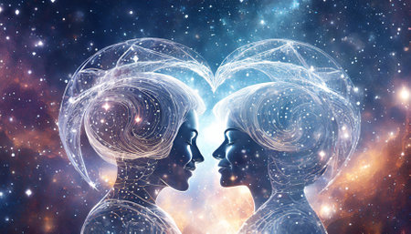 This conceptual illustration depicts two human-like figures facing each other, illuminated by a celestial glow. The figures are set against a dark, starry backdrop with a constellation of light above. The color palette emphasizes blues and whites, and the artwork could be suitable for various commercial uses, including editorial and design projects.
