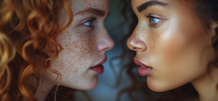 Two women with freckled hair are shown in close proximity, their distinctive freckles clearly visible. The womens hair is highlighted, showcasing the unique freckled pattern that adds character to their appearance.