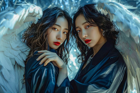 Ethereal Twin Women with Angel Wings in Mystical Forest Setting, Surreal Portrait with Majestic Blue Tones AI Generative