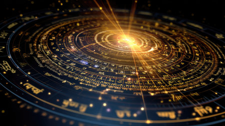 An intricate, golden zodiac chart or astrological wheel glows with sparkling stardust and wisps of smoke against a dark cosmic background. This mystical image is perfect for fortune-telling and esoteric themes.