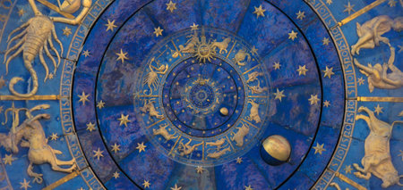 Zodiac wheel with astrological symbols and celestial elements