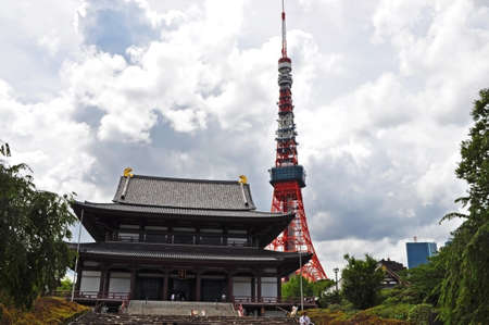 SHIBAKOEN, TOKYO - AUGUST 12, 2014: Tokyo Zojo-ji Temple with the Tokyo tower is the landmark and symbol of Tokyo