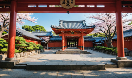 A red torii gate stands open at a Japanese temple, leading to a courtyard with cherry blossom trees in bloom