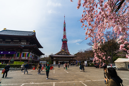 TOKYO, JAPAN - March 25, 2019: Unidentified tourists visit in ancient Zojoji temple with Tokyo tower background ,This is a famous place in Tokyo, Japan.