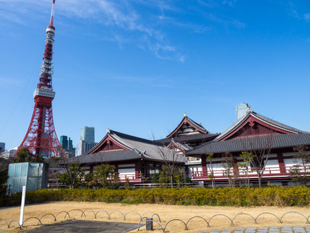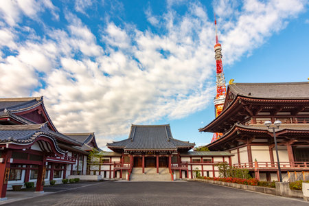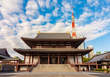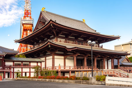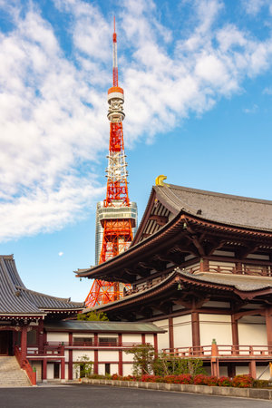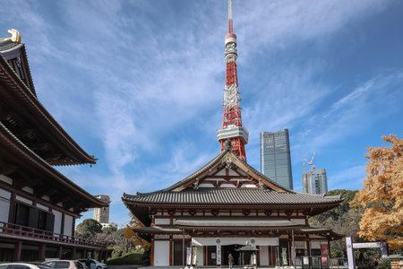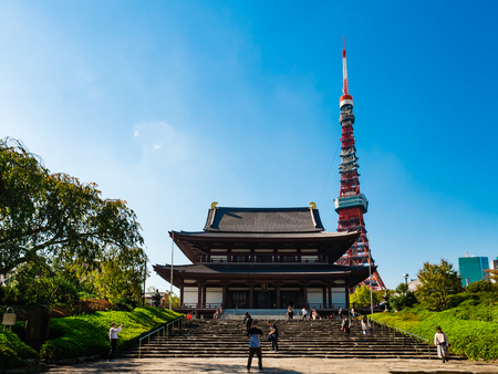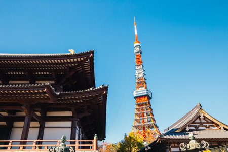 Tokyo, Japan - October 30, 2018: Zojo ji Temple and Tokyo Tower in Tokyo, Japan. It is the main temple of the Jodo-shu Chinzei sect of Buddhism in the Kanto region.