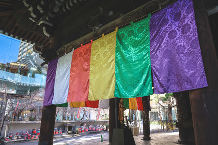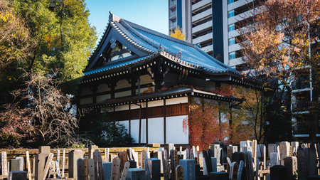 Ryukoku-ji, a Buddhist temple in Ueno, Taito Ward, Tokyo, Japan, features a small cemetery and a vibrant garden. Nestled amidst towering office buildings and residential apartments, it offers a serene contrast to the bustling cityscape.