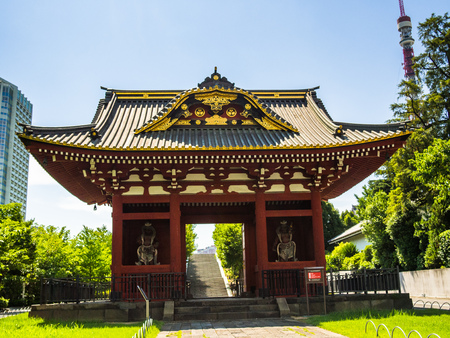 Tokyo, Japan- 11 May, 2024: Ancient Zojoji temple in blue sky.