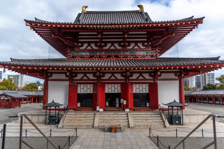 OSAKA, JP - APRIL 8 - Shitennoji Temple facade on April 8, 2017 in Osaka, Japan. Shitennoji is a Buddhist temple and regarded as the first Buddhist and oldest officially administered temple in Japan.