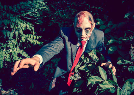 Manager zombie walking dead outdoors. Dark lighting. Color was changed to emphasize the atmosphere of horror.