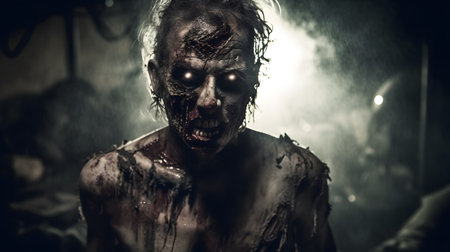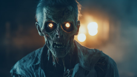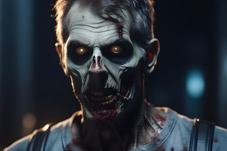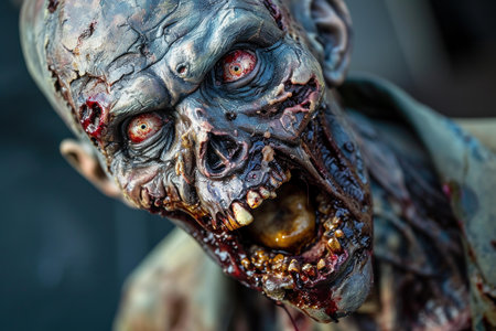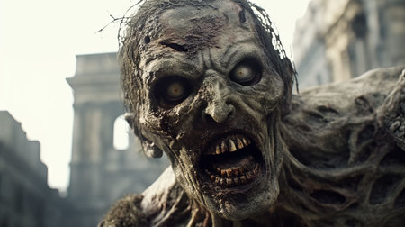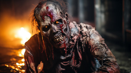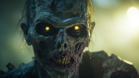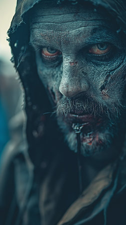 Close-up shot of a gruesome zombie with detailed makeup, showcasing horror and fear