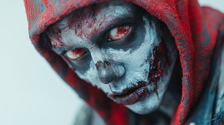 A close-up portrait of a person with a creepy zombie-like face paint and a red hooded sweatshirt