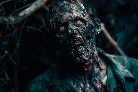a zombie with big bulging eyes strolls through the forest, captured in a photographically detailed portrait. the image showcases light bronze and yellow tones, employing photo-realistic techniques. the composition highlights earthcore elements and utilizes selective focus to create a dark and explosive atmosphere. this photograph masterfully captures the essence of suburban ennui. ai generated