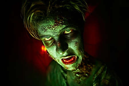 Halloween, horror movie. Close-up portrait of a scary zombie boy teenager in green light.
