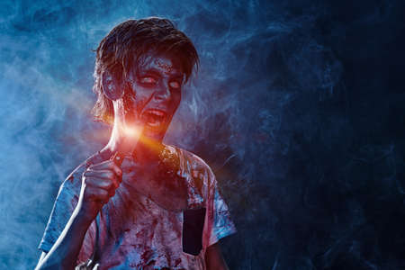 Halloween, horror movie. Portrait of a scary zombie boy teenager picking his mouth with a knife on smoky background.