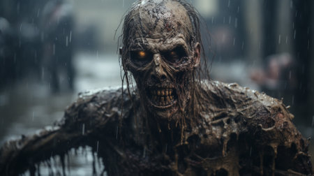 a close-up shot of a realistic zombie running through a dense forest. this national geographic-style photo captures the intricate details of the zombie's decaying flesh and haunting expression. the eerie atmosphere is enhanced by the use of rtx technology, creating a truly immersive and chilling experience. ai generated