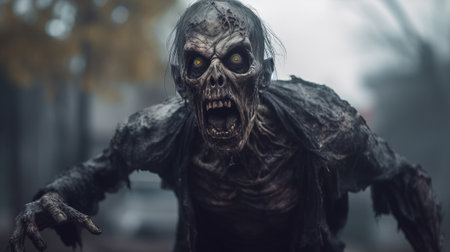 a walking dead man with swaying hands emerges from a forest, showcasing detailed facial features. the dark gray and yellow tones add to the eerie atmosphere, while the shiny eyes enhance the zombiecore aesthetic. this close-up shot captures the intricate costumes and highlights the vfxfriday element. ai generated