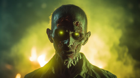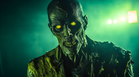 a black-eyed zombie with green eyes emerges from the darkness, showcasing hyper-realistic sculptures and softbox lighting. the image captures the essence of grandparentcore, suburban ennui, and explosive pigmentation, with a color palette dominated by dark yellow and green. ai generated