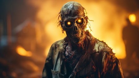 a zombie with hands painted in is captured walking on a dark floor, accompanied by a burning candle. the photo showcases the realistic sculptures, detailed costumes, and the use of light bronze and light amber tones. the softbox lighting adds depth to the image. this close-up shot highlights the strong facial expression of the zombie, creating a captivating and eerie atmosphere. ai generated