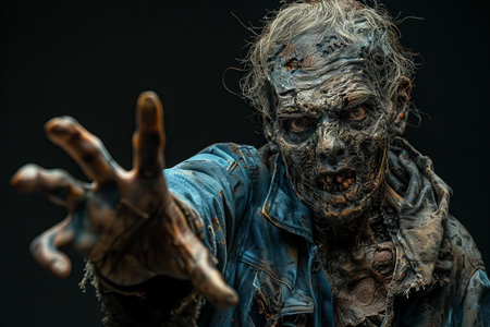 Photo of scary zombie man with dirty blue blue jacket, reaching out to the camera, dark background