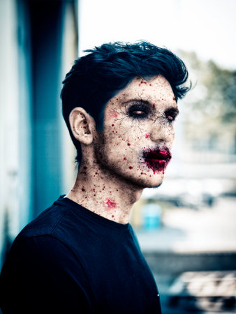 Zombie male makeup for halloween concept. Make up skin and blood face