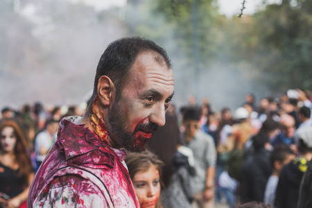 MILAN, ITALY - OCTOBER 10: People take part in the Zombie Walk, social event in the city streets just before Halloween on OCTOBER 10, 2015 in Milan.