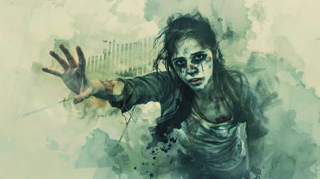 Surreal watercolor painting of a distressed woman reaching out with a blend of abstract and realistic elements. Concept of emotional struggle, artistic expression, human connection, zombie, Halloween.