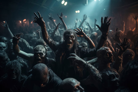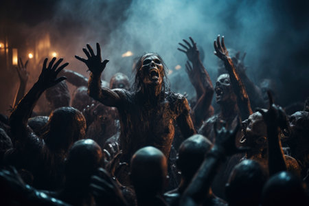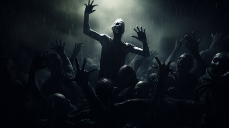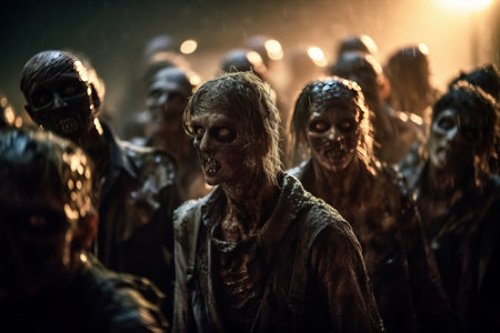 scary image of zombies in the dark, inspired by noah bradley's style. this artwork by spiritualcore showcases theatrical gestures and dramatic light and shadow, reminiscent of andreas achenbach's work. rendered in cinema4d, the image captivates with its wet-on-wet blending technique, creating an eerie and haunting atmosphere. ai generated