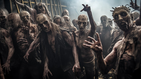 A horde of zombie silhouettes in misty fog, against a dark and eerie sky, perfect for a spooky Halloween concept.