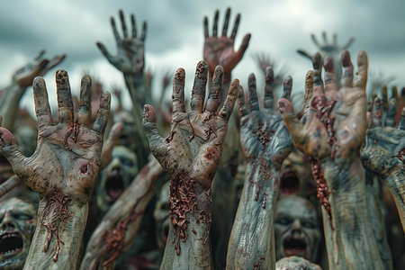 Digital image of of many zombie hands reaching out from the ground, cloudy sky background, horror concept
