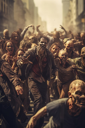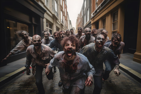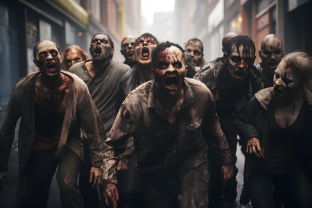 Zombie people walking in the street at night. Halloween concept. Generative AI