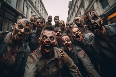 Bloodthirsty evil zombies attack on city street. Focus on creepy fantasy creature in torn skin with snarling bloody face. Generative AI
