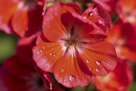 Dewdrops on the vibrant red petals of a geranium flower, adding a refreshing touch to a garden scene.
