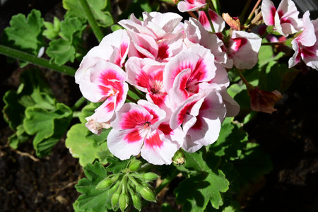 Pink bicolor geraniums in the home garden, Flower blackgound for design.