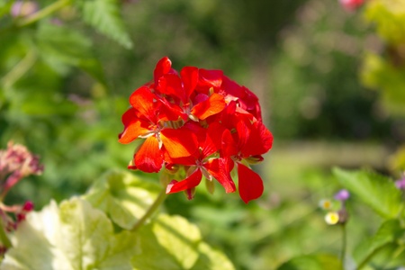 Vibrant red geranium flowers blooming in a sunny garden during late spring with lush green foliage surrounding them