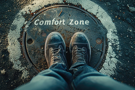 A top-down perspective captures a persons feet clad in red sneakers, standing on a textured asphalt surface. Around their feet, a clearly visible white chalk circle is drawn, containing the words COMFORT ZONE. An arrow, also rendered in white chalk, points directly forward from the circle towards the right side of the frame. At the end of this arrow, the impactful phrase WHERE THE SUCCESS HAPPENS is written in chalk. The entire scene powerfully illustrates the motivational concept of personal development, encouraging individuals to move beyond their familiar boundaries to achieve goals, embrace new challenges, and realize greater accomplishments. The rough texture of the ground and the casual footwear ground the abstract idea in a relatable, everyday context of growth and change.