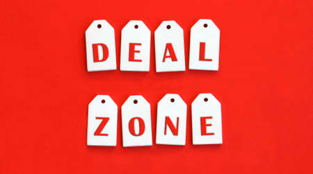 Eight white wooden tags with the word DEAL ZONE on a red background. Sales concept.
