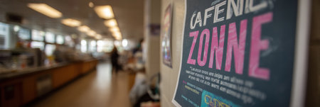A colorful poster in a school cafeteria highlights the importance of caffeine awareness, set against a busy lunch area with students.