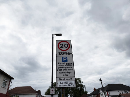 Urban street sign in Manchester showing a 20 zone parking rule and upcoming event times.