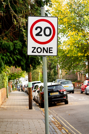 20 mph zone, road sign, seen in UK.