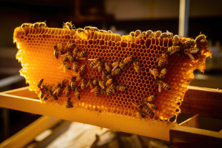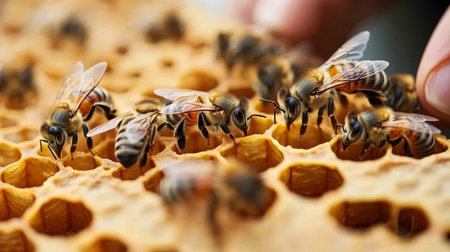 Honeybees working diligently inside their hive, meticulously crafting honeycomb cells filled with glistening. Worker bees. Generative ai