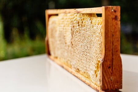 Frames of a beehive. Busy bees on the yellow honeycomb with open and sealed cells for sweet honey. Bee honey collected in the beautiful yellow honeycomb.